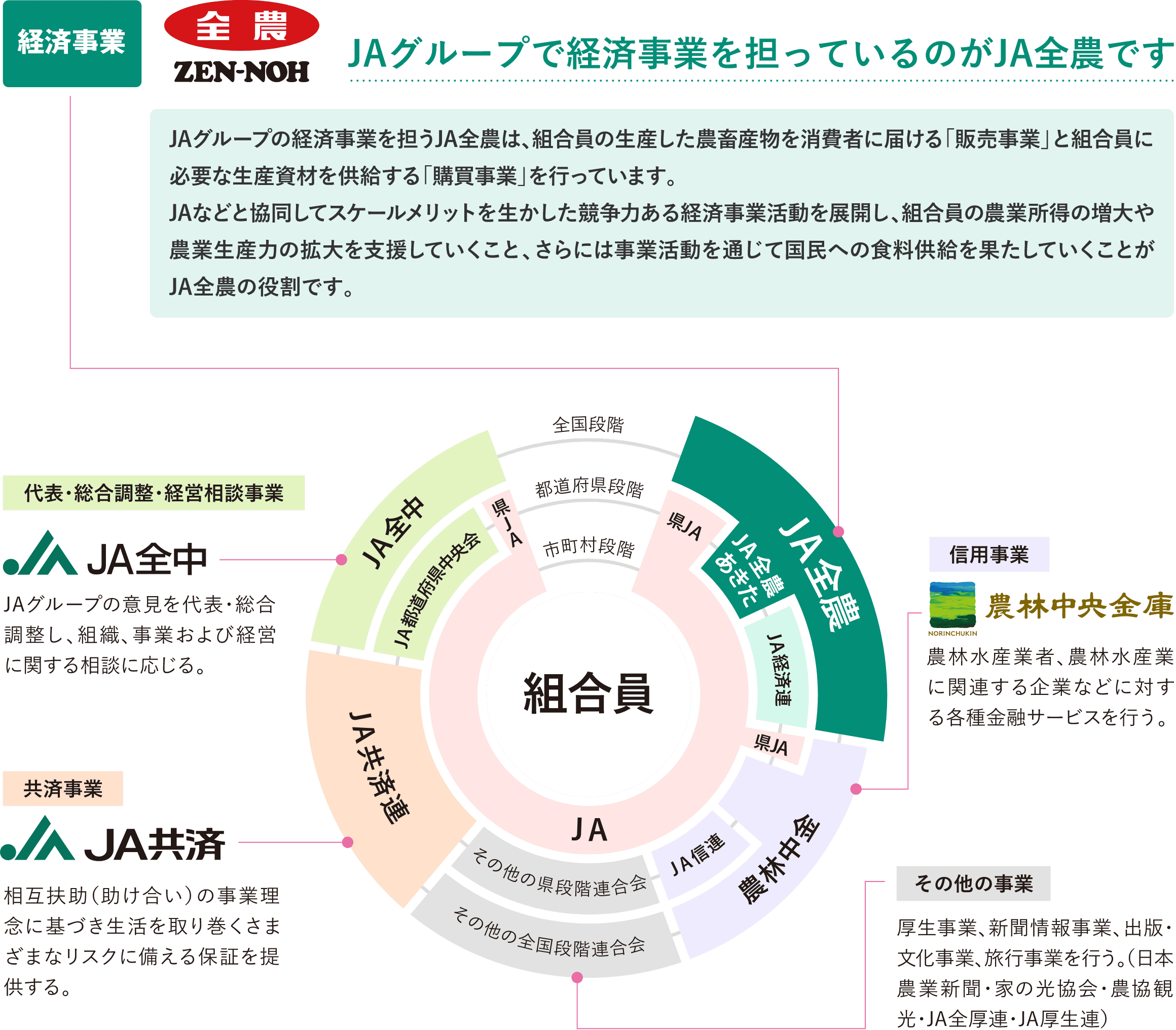 JA(農業協同組合)は個々の農業者が互いに助け合って、営農と生活を守り高めることを目的に設立された協同組合です。